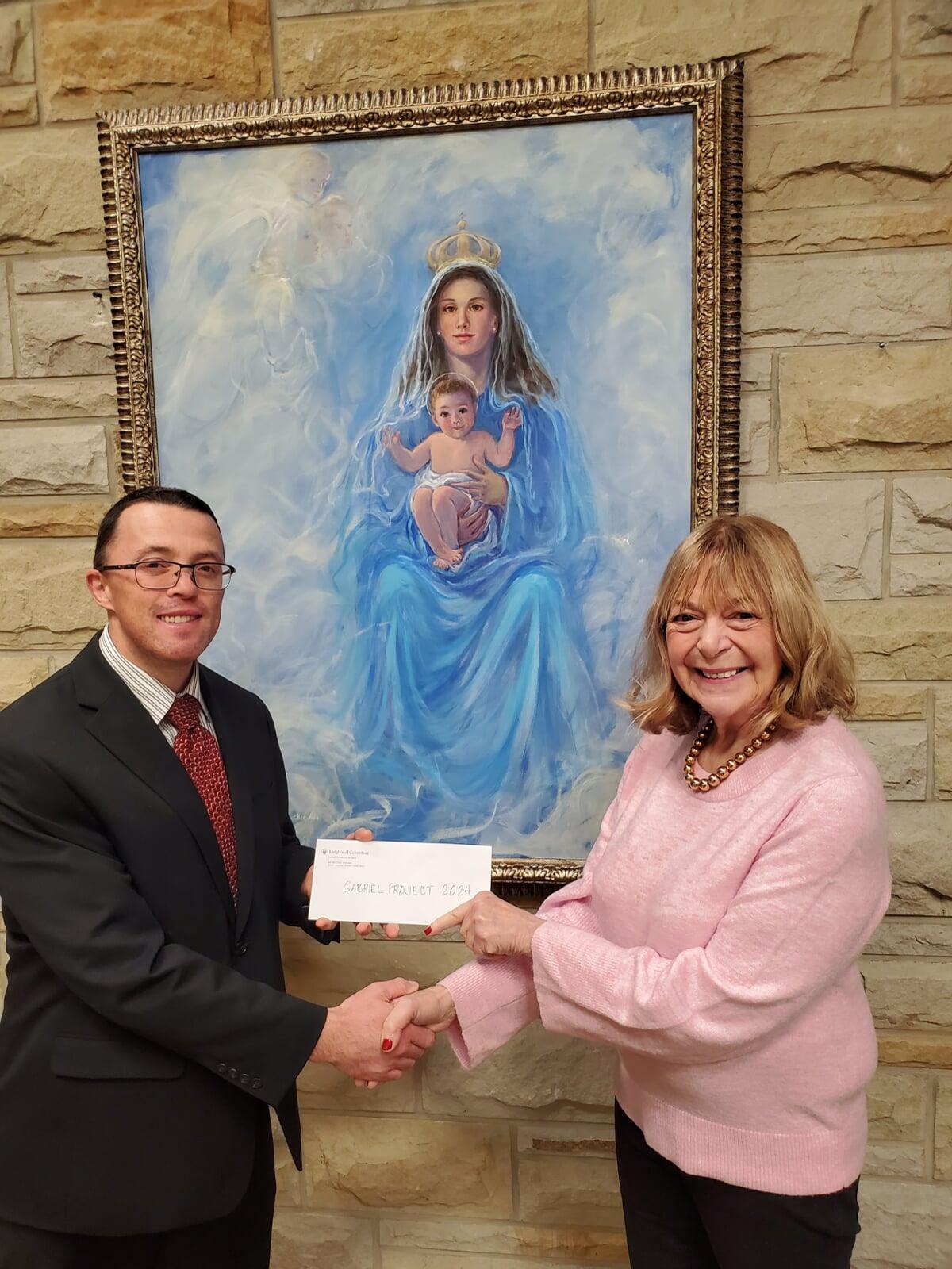 St. Joseph's Catholic Academy, in the person of the Principal Anna Ruprecht, receives a check from the Knights for Scholarships in the amount of $10,000. The Knights support Catholic Education monetarily, and the funds are earned predominantly from the Beaver Stadium Concession Stand (so thanks again to the Concession Stand Team led by Rodney and Steve).