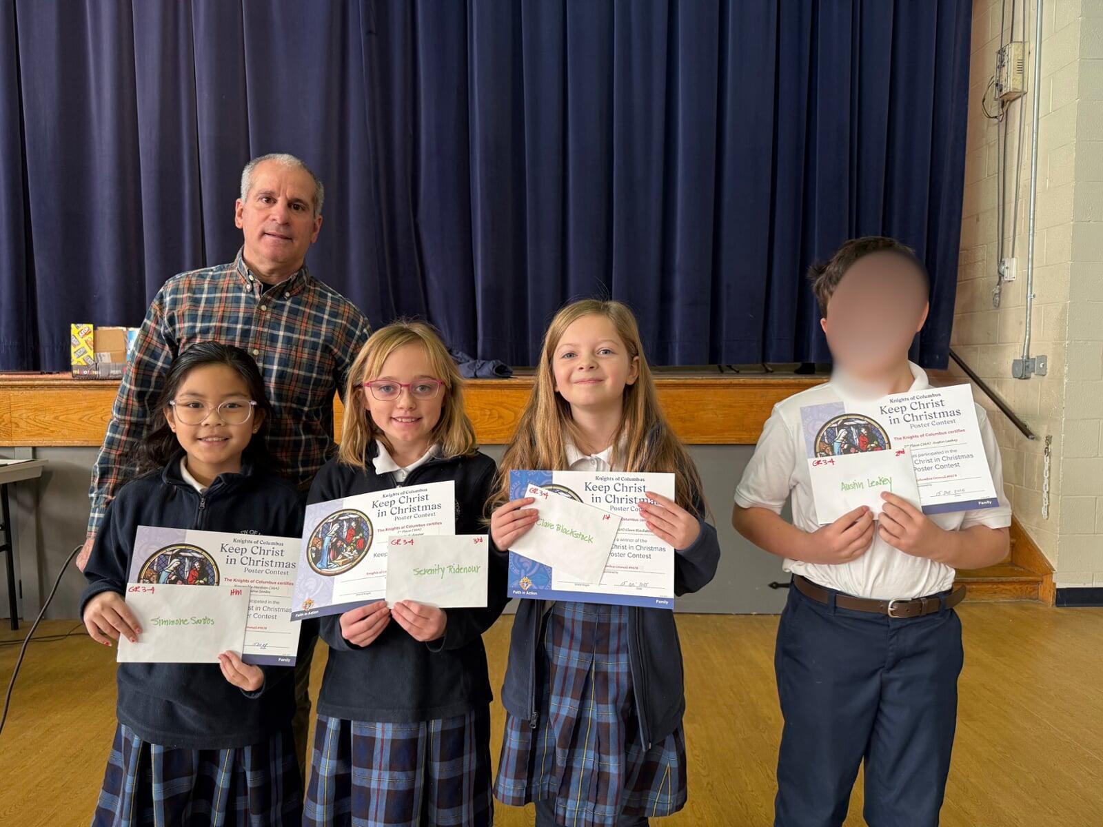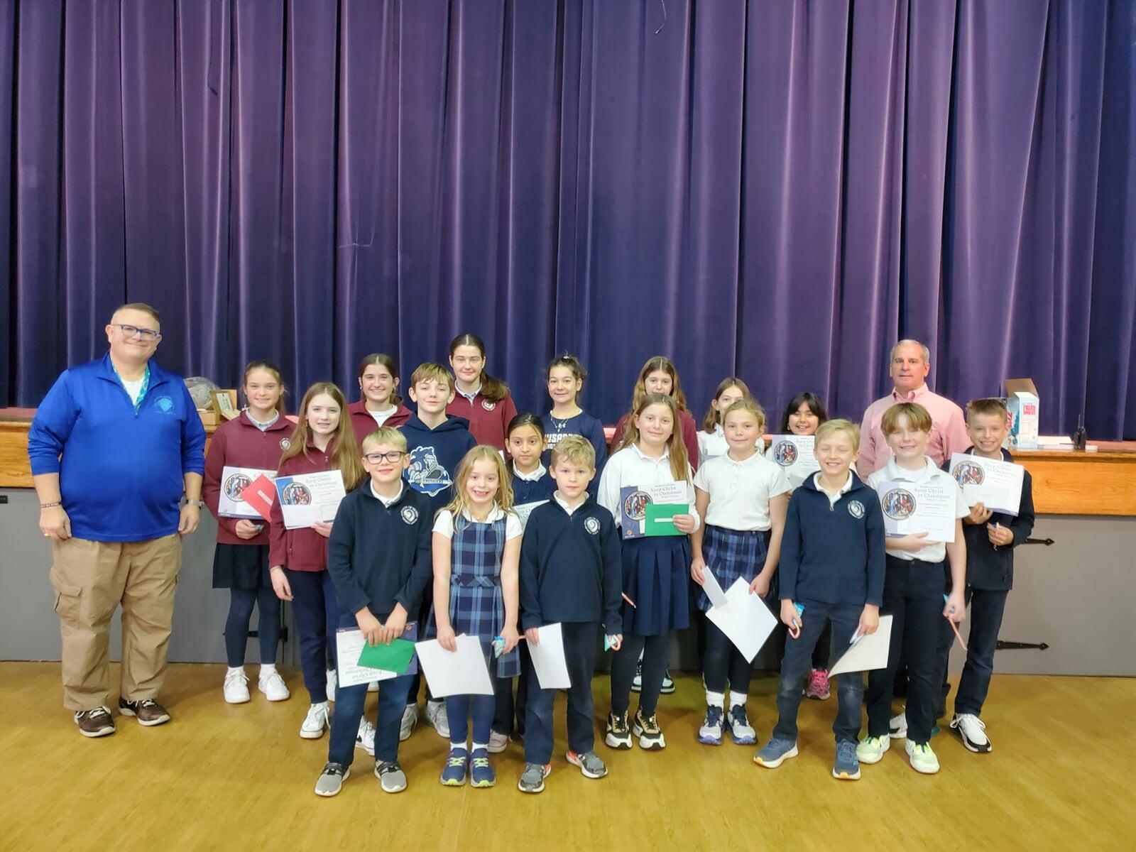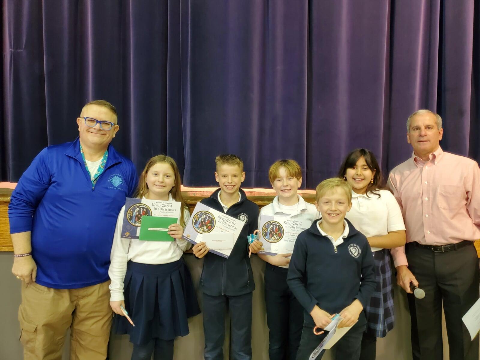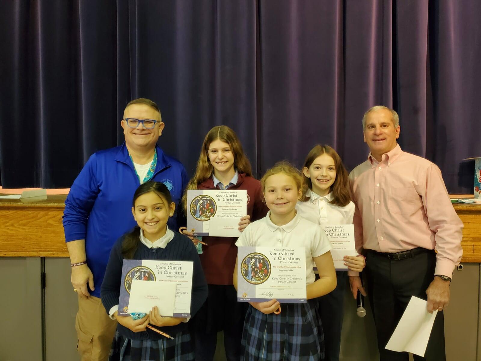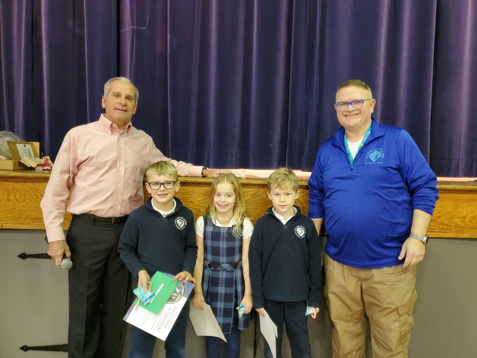 Our Lady of Victory School, in the person of the Principal Samantha Weakland, receives four checks from the Knights. A check for Scholarships in the amount of $4,000. A check for the OLVC Preschool for $1,000. A check for the Walk-Thon for $500. And a check for OLVCS Athletics for $500. The Knights support Catholic Education monetarily, and the funds are earned predominantly from the Beaver Stadium Concession Stand (so thanks again to the Concession Stand Team led by Rodney and Steve).