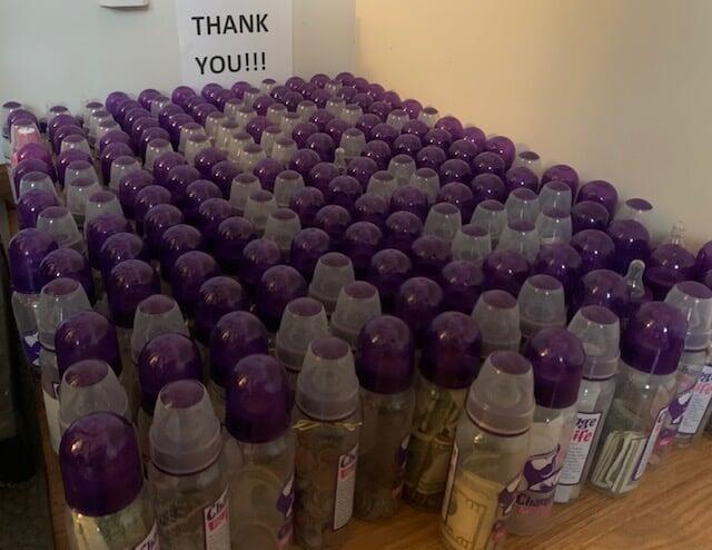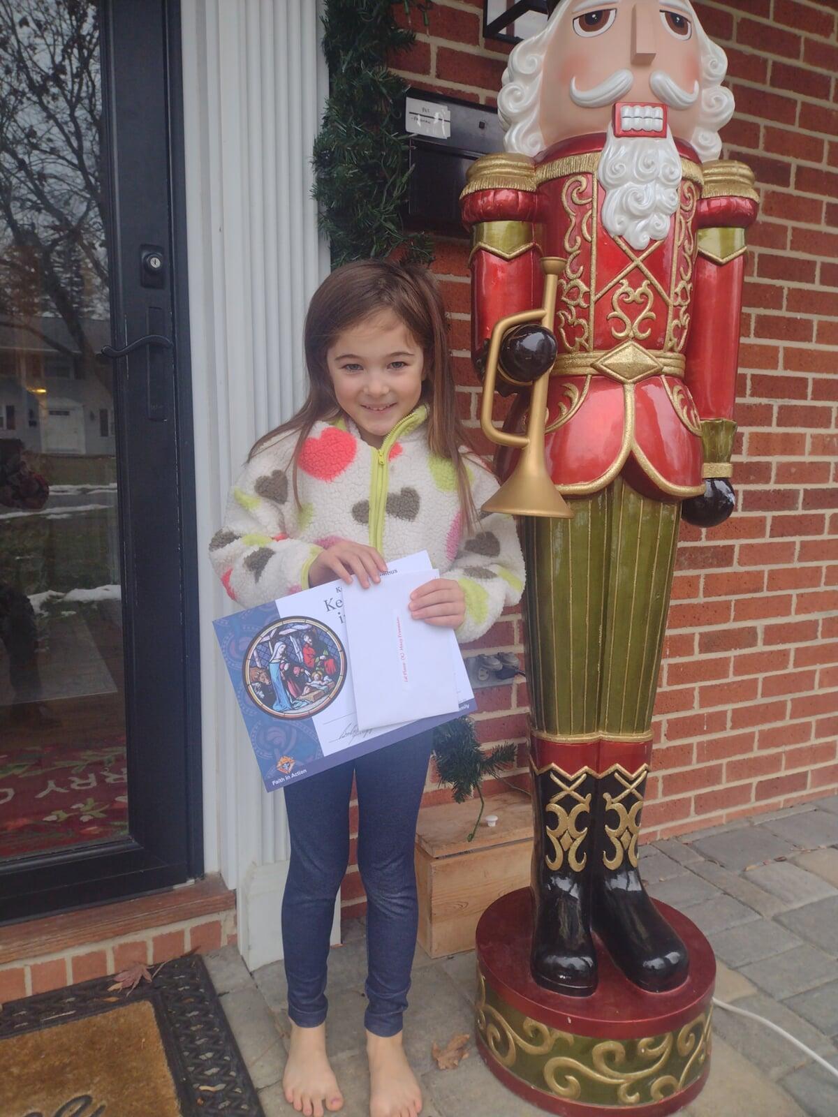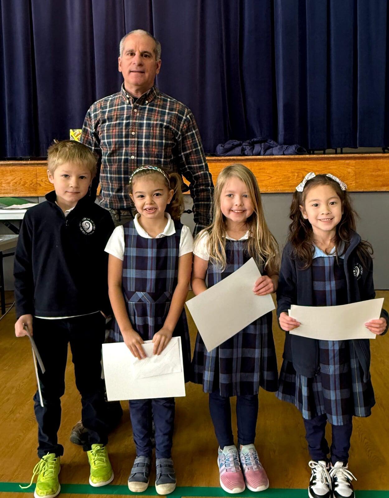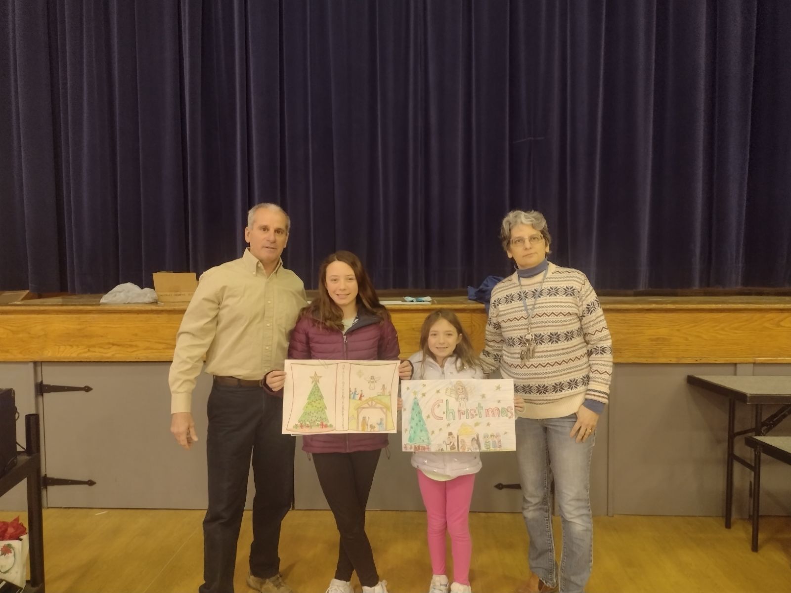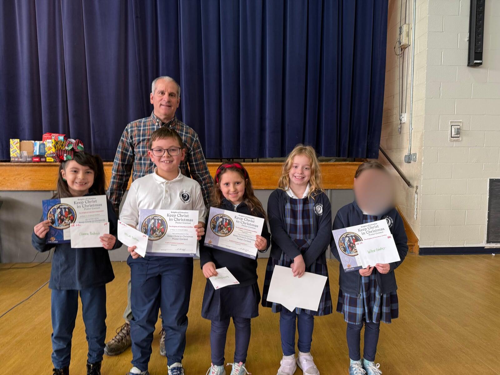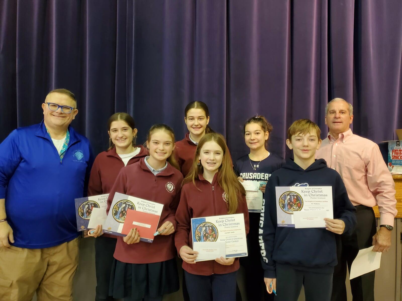 Our Lady of Victory School, in the person of the Principal Samantha Weakland, receives four checks from the Knights. A check for Scholarships in the amount of $4,000. A check for the OLVC Preschool for $1,000. A check for the Walk-Thon for $500. And a check for OLVCS Athletics for $500. The Knights support Catholic Education monetarily, and the funds are earned predominantly from the Beaver Stadium Concession Stand (so thanks again to the Concession Stand Team led by Rodney and Steve).